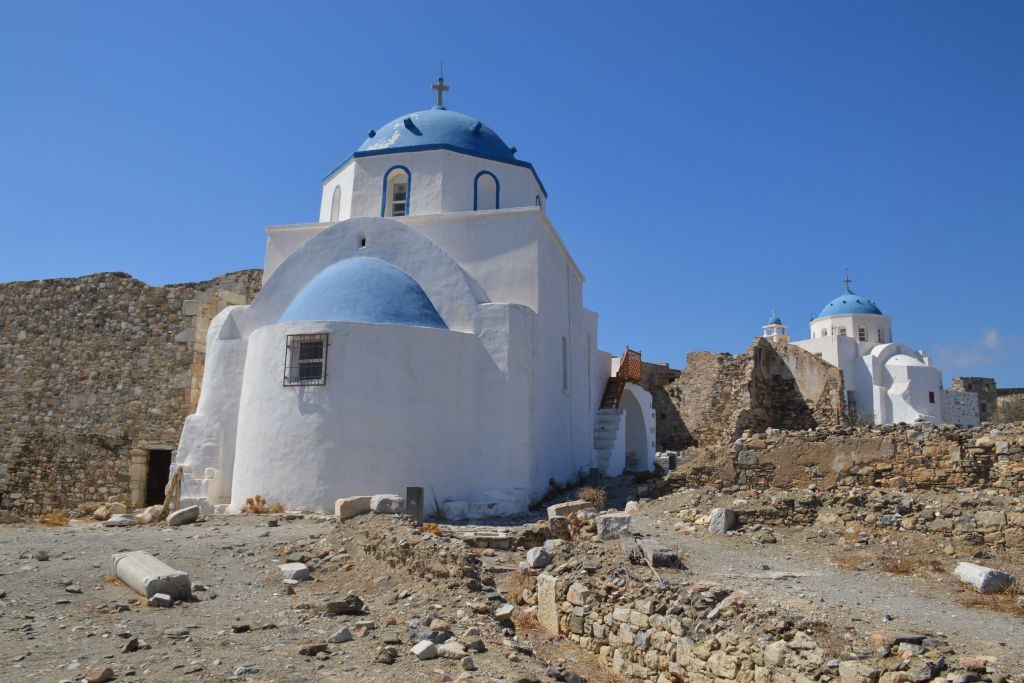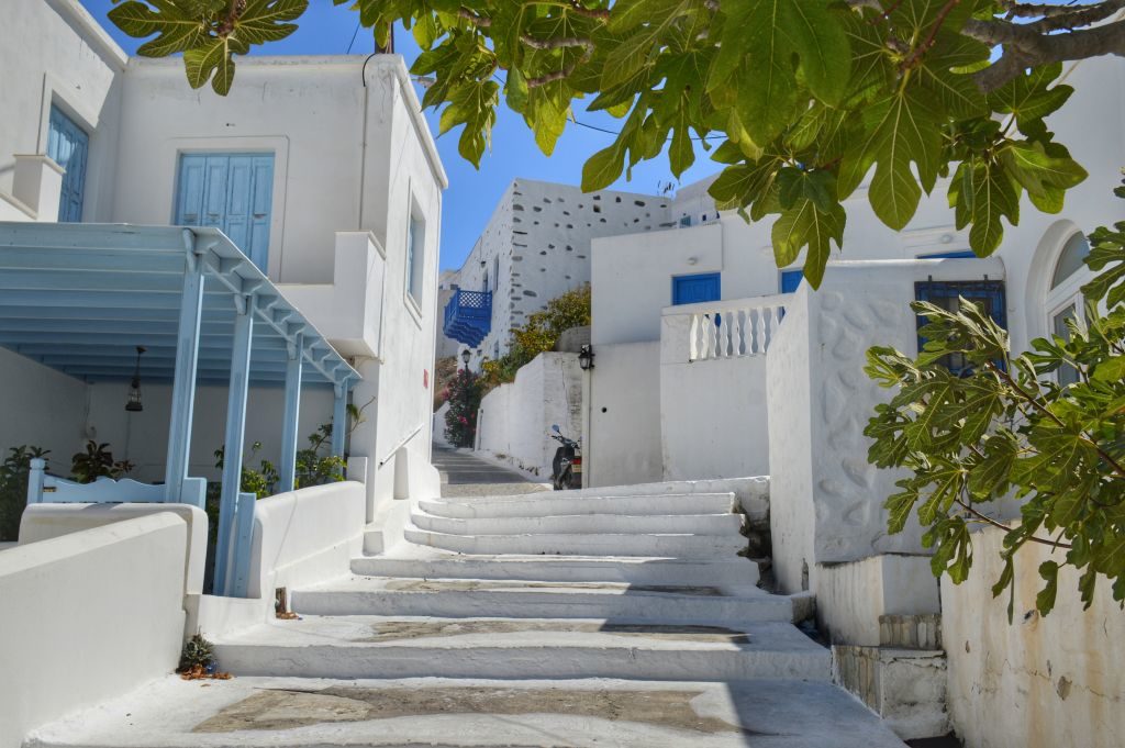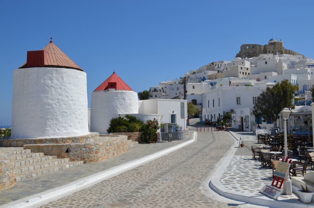 Ook het uitzicht vanaf het kasteel zelf is spectaculair. De zee en lucht aan de horizon is eindeloos blauw. Om de top te bereiken, dwaal je eerst door de smalle straatjes van het hoofdstadje Chora. Vergeet vooral je camera niet, want die zal overuren maken. Het ene straatje is namelijk nog fotogenieker dan het andere. Je passeert spierwitte huisjes met gekleurde kozijnen, kerkjes met blauwe koepels, roze bloemen en fotogenieke windmolens.