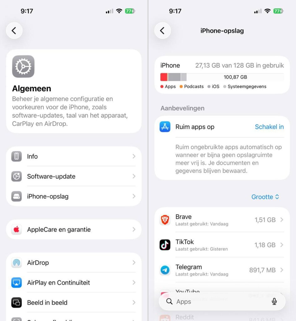Ga naar Instellingen > Algemeen > iPhone-opslag om te zien welke apps veel ruimte gebruiken. Let vooral op de extra opslag naast de app zelf, zoals cache en downloads. Soms is de app klein, maar nemen deze gegevens veel ruimte in.