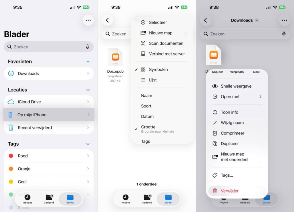 De app Bestanden is een vaak vergeten plek waar opslag kan oplopen. Documenten, downloads, exports en media uit andere apps stapelen zich hier ongemerkt op, soms jarenlang. Ook sommige apps slaan op de achtergrond bestanden op, dus het is de moeite waard om dit te controleren, zelfs als je niets bewust hebt gedownload.