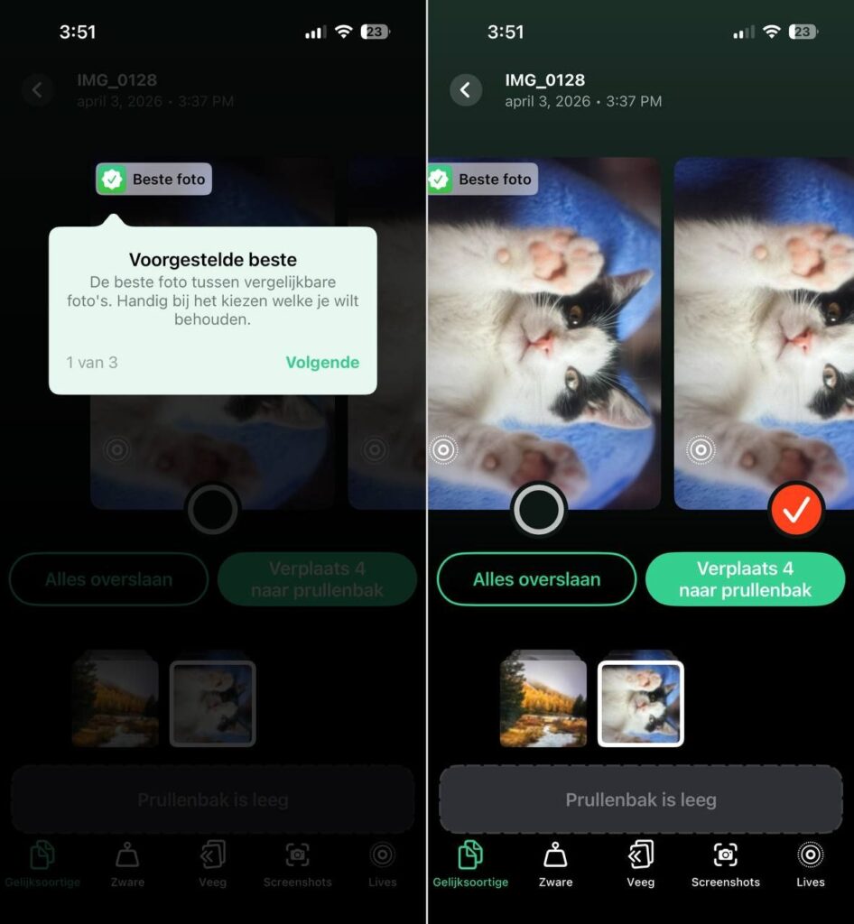 Naast het verwijderen van duplicaten, kan je met Clever Cleaner ook op andere manieren extra ruimte vrijmaken in je galerij. De sectie Zware bestanden toont grote video’s en foto’s, Screenshots verzamelt al je schermafbeeldingen op één plek, Lives zet Live Photos en zware video’s om naar stilstaande beelden, en de veegmodus laat je foto’s één voor één bekijken als je handmatig op wilt schonen.