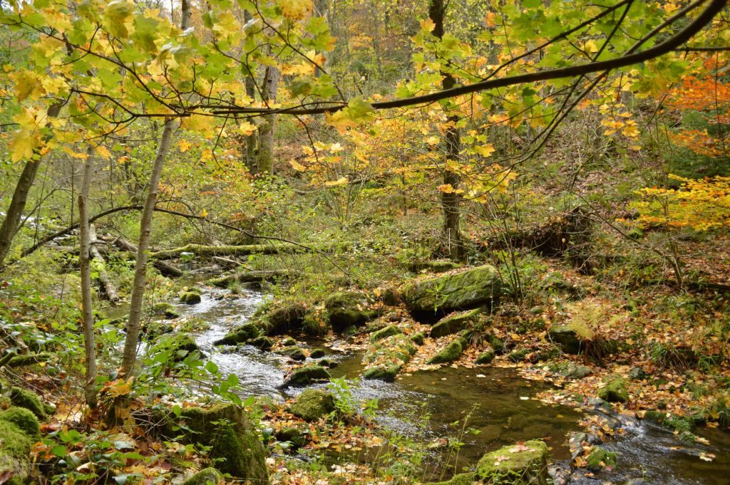Volg de groene rechthoek en wandel over onverharde paden door een beboste vallei en langs de oevers van een kabbelend beekje. Tijdens de wandeling is het klimmen en dalen en word je getrakteerd op mooie uitzichten, die vooral in het najaar betoverend zijn met al die mooie herfstkleuren!
