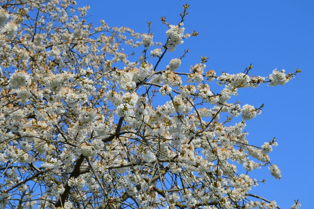 Langs de weg staan de kersenbomen volop in bloei. De witte bloemetjes steken prachtig af tegen de blauwe lucht. In de hoogstamboomgaard staan tientallen oude kersenbomen met een zeldzame hoogte van zo’n tien tot vijftien meter. Hoewel de kersenbomen in de Betuwe vroeger allemaal zo hoog waren, zijn de meesten tegenwoordig nog geen drie meter.
