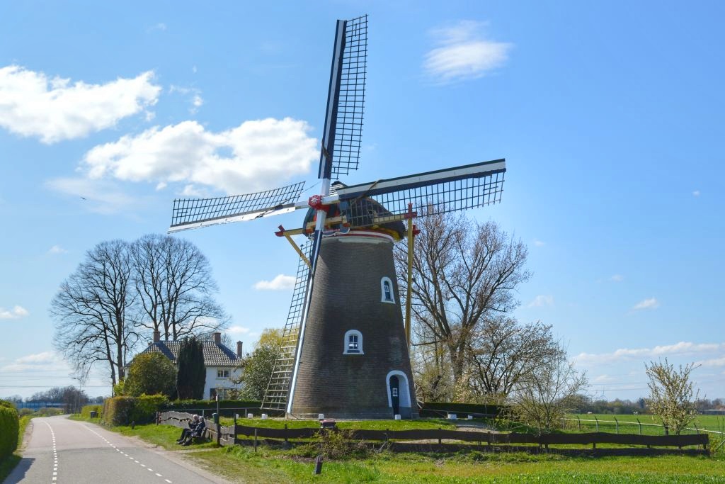 Bij Molen de Korenbloem (1775) lopen we het gras op voor een miniwandeling langs de oever van de Linge. Vlinders fladderen speels om ons heen, terwijl we ons een weg manoeuvreren langs de hopen ganzenpoep. Het stukje langs de Linge is eigenlijk veel te kort naar ons zin, maar gelukkig kunnen we het laatste deel van de route nog genieten van fruitbomen in alle soorten en maten. De witte en roze knoppen staan te popelen om zich te ontpoppen tot prachtige bloemen.