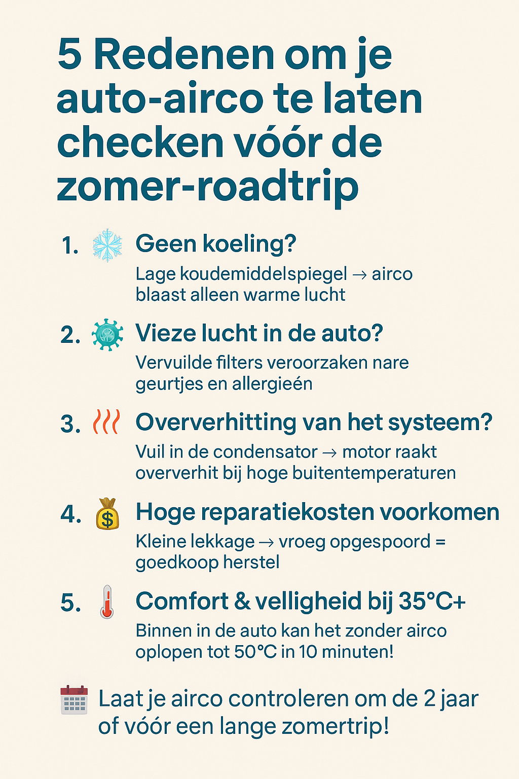 Tip: Laat je airco controleren om de twee jaar of vóór een lange zomertrip. Zo kan jij deze zomer met een optimaal werkende airco op pad en genieten van je roadtrip zonder zorgen over oververhitting of oncomfortabele temperaturen in de auto.