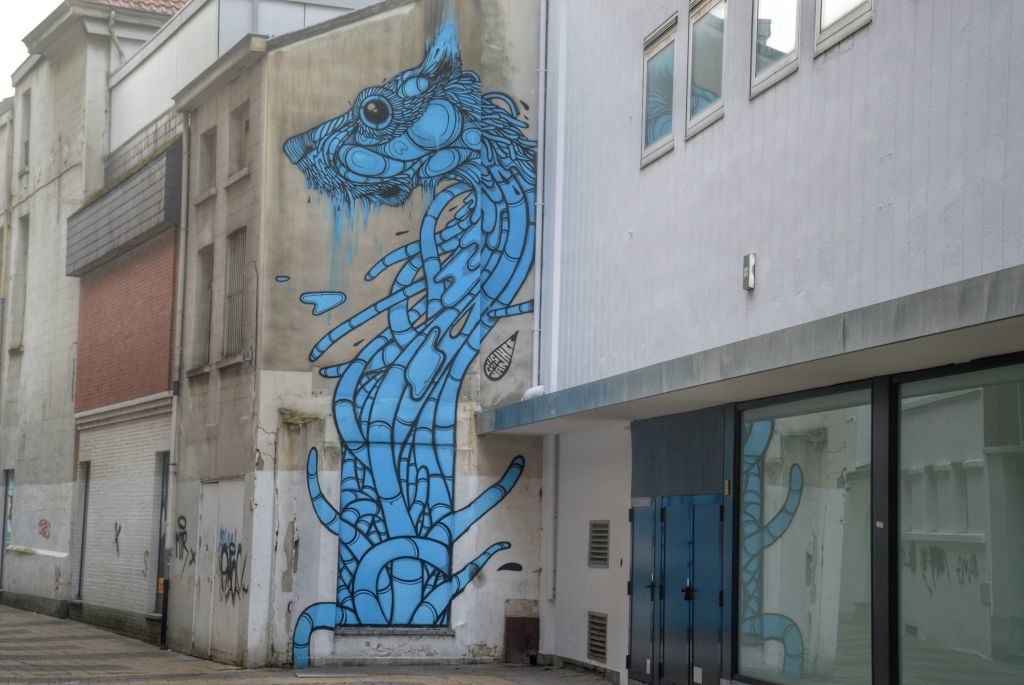 Naast zijn muurschildering voor Mechelen Muurt, creëerde stadskunstenaar Gijs Vanhee nog meer murals in Mechelen. Ik spotte er drie in de binnenstad. Zo stond ik in de Moensstraat ineens oog in oog met een uil, die hij op de muur van de bibliotheek schilderde. Ook toverde hij in 2015 een blauwe hond op een grauwe muur in de Blauwhondstraat. Eén keer raden waar hij zijn inspiratie voor deze creatie vandaan haalde…
