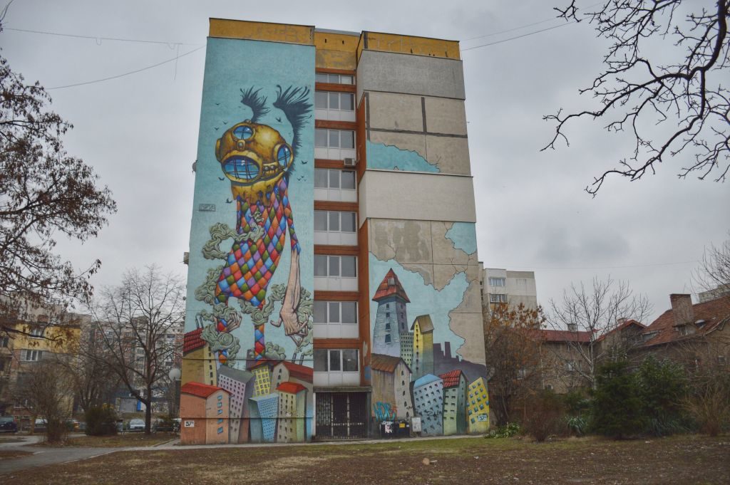 Een van die pareltjes in de wijk is een portret van Dobri Dobrev, beter bekend als de Heilige van Bailovo of Opa Dobri. Deze onbaatzuchtige man wandelde tot zijn dood elke dag 20 kilometer naar de Alexander Nevsky kathedraal om daar geld te collecteren voor goede doelen. Met de donaties onderhield hij verschillende weeshuizen, ziekenhuizen en talloze daklozen. Helaas stierf hij vorig jaar op een respectabele leeftijd van 103 jaar. De muurschildering dateert uit 2013.