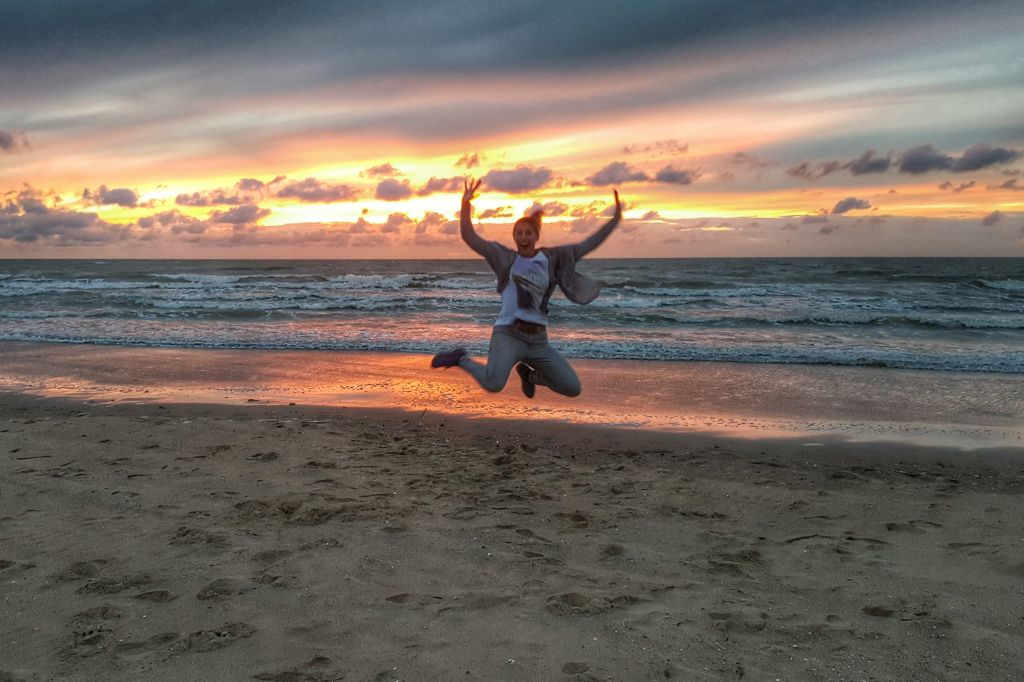 We hebben gelezen dat er in Middelkerke, twee kilometer verderop, een uitkijktoren staat. Vanaf de Warandetoren kan je op een hoogte van twintig meter de zon in de zee kan zien zakken. Hoewel dat waarschijnlijk een prachtig plaatje oplevert, hebben wij geen zin meer om dat stuk te lopen en houden we het op wat acrobatiek in de branding.